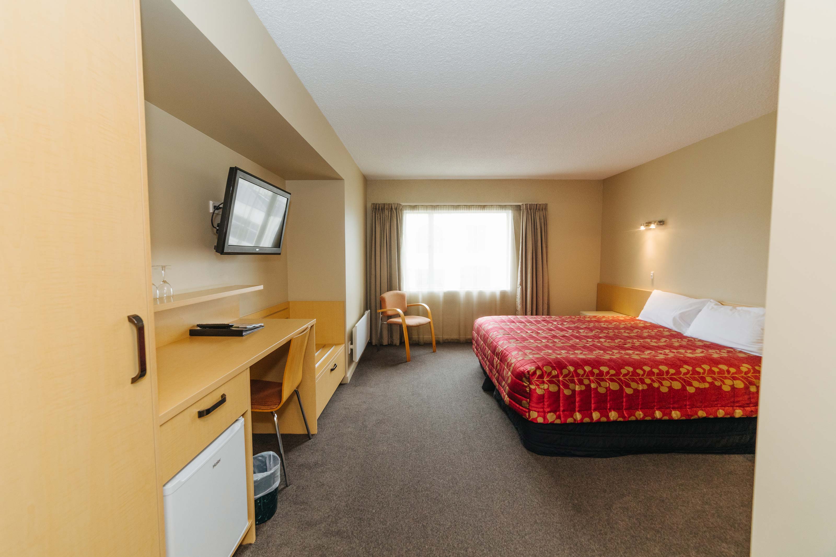 A newly renovated spacious studio, featuring a King bed and wheelchair accessible bathroom.